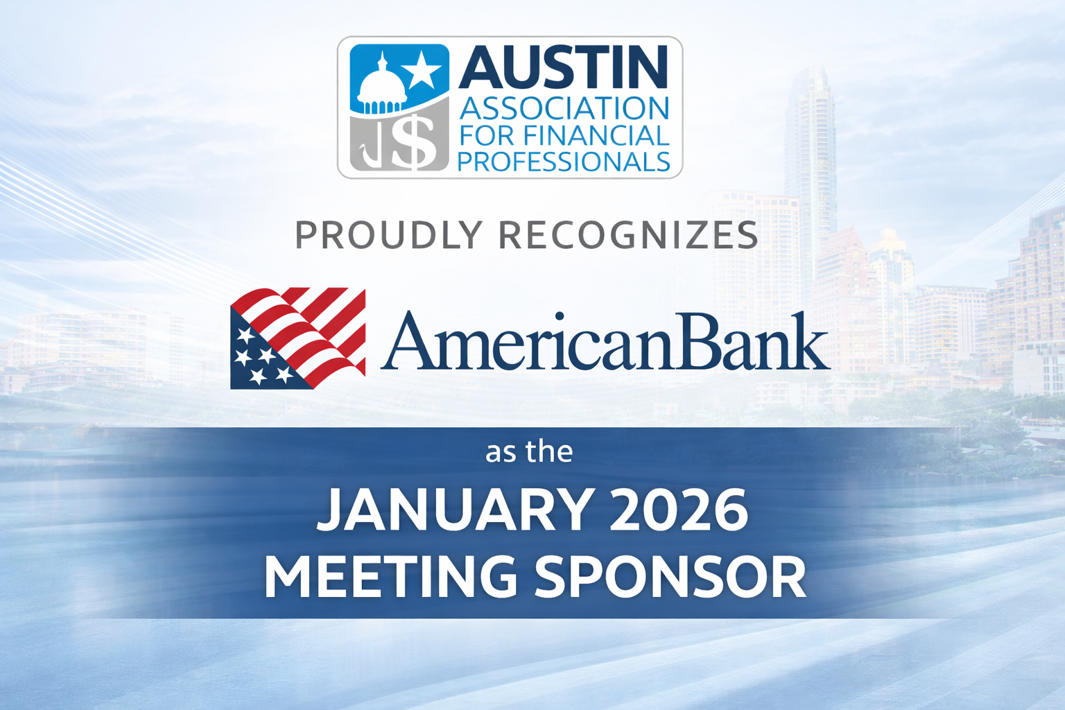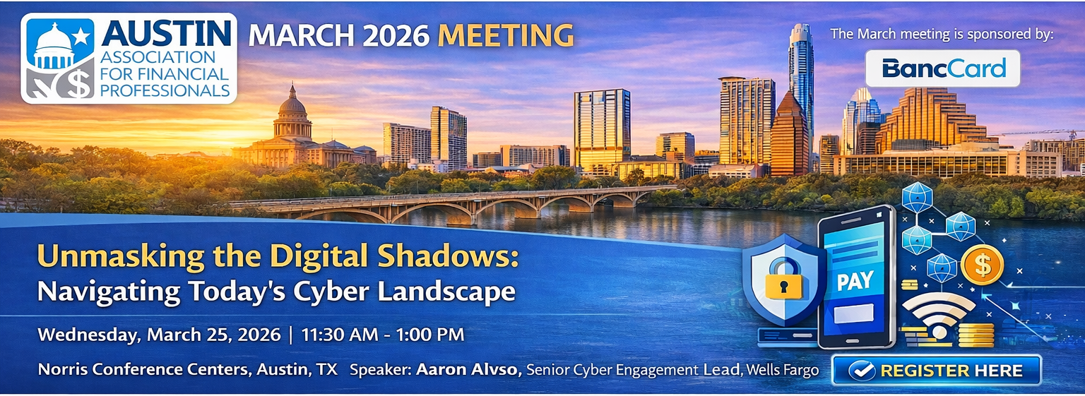 Welcome to the Austin Association for Financial ProfessionalsThe Austin Association for Financial Professionals (AAFP) is a non-profit organization created for the purpose of providing and maintaining a forum for the active and open exchange of ideas, concepts and techniques related to the rapidly changing field of cash and treasury management. Austin AFP strives to educate our members, associates and guests by holding seven meetings per year, generally on Wednesdays or Thursdays and include lunch or dinner, an educational program and time for networking with fellow members. Educational programs cover a range of treasury and finance topics including government regulations, cash collection and disbursement, fraud issues, bank products and services, investment strategies, foreign exchange, economic trends and issues and risk management. Benefits of Membership